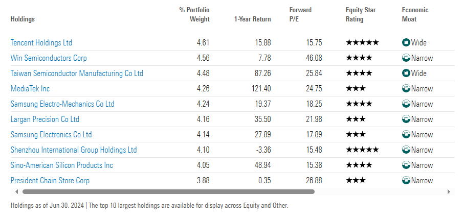 前十大持仓股为:腾讯、台股稳懋半导体、台积电、联发科、三星电机、大立光、三星电子、申洲国际、台股中美晶、台股统一超商。