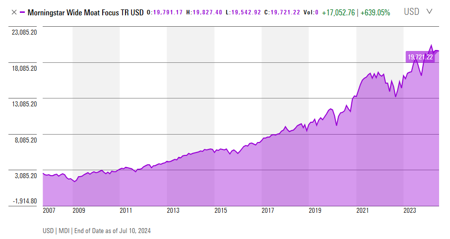 例如,评级机构Morningstar编制了“Morningstar Wide Moat Focus宽护城河指数”,自2007年指数成立以来,该指数已涨超630%,长期回报跑赢标普500,境外投资者可以通过跟踪该指数的MOGT ETF来投资。