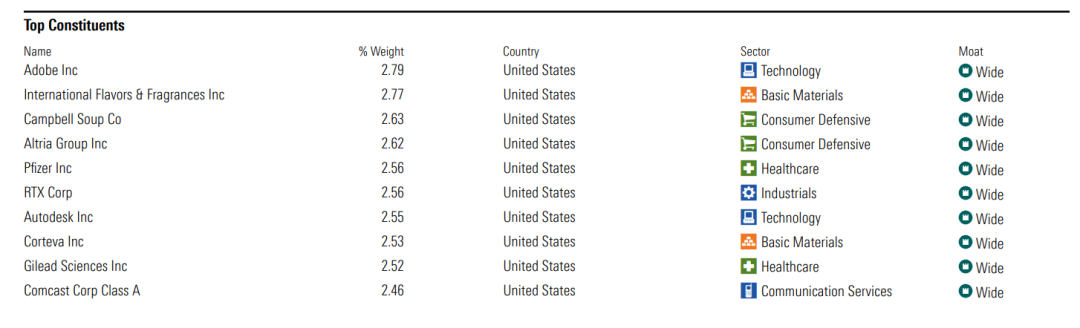 简单来说,该指数就是字面意思,Morningstar会给上市公司的护城河评分,若护城河评分是“宽”,那就符合列入指数内的条件。截止最新,目前整个指数共有55家公司,都是美股公司。