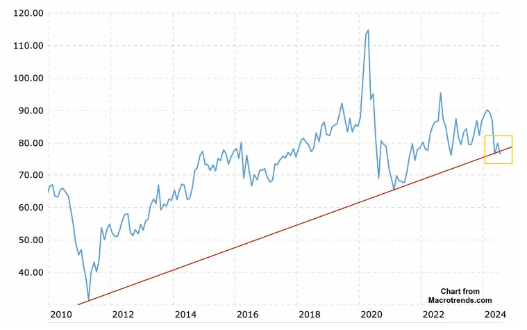 三个月前,金银比攀升至高达87比1。两个月前,该比率降至约73比1,跌破了13年的支撑水平。该比率一度反弹至80比1,但未能收回13年的支撑位,然后在过去五天内跌至当前水平。