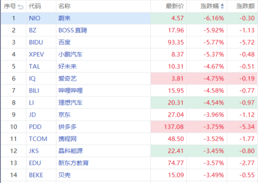 其中,蔚来跌超6%,百度、小鹏汽车跌超5%,好未来、哔哩哔哩、理想汽车跌超4%,京东、拼多多跌超3%。