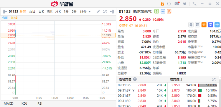7月16日,哈尔滨电气早盘高开,截至发稿,涨10.89%,报2.85港元,成交额537万港元。