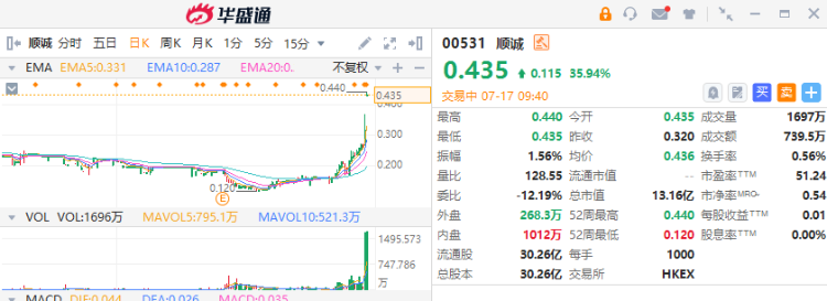 顺诚(00531)复牌飙升35.94%,现报0.435港元,成交额549.03万港元。
