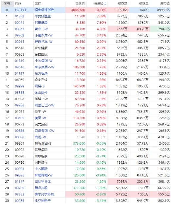 互联网医疗概念大涨,平安好医生、阿里健康飙涨逾7%;造车新势力延续反弹趋势,蔚来涨超4%,小鹏汽车-W、理想汽车-W涨超3%。