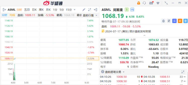 阿斯麦 $ASML 盘前大跌超5%。消息面上,阿斯麦刚刚公布Q2业绩显示,虽然二季度的订单量为55.7亿欧元,高于市场一致预期(卖方预期)的44.1亿欧元,但低于最乐观的买方预期60-80亿欧元。