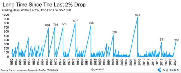 截止本周二收盘,标普500指数在创下年内第38个历史收盘新高的同时,还有一组数据令人艳羡——该指数已连续351个交易日,没有出现过2%及以上的单日跌幅,追平了自全球金融危机爆发以来最长纪录。