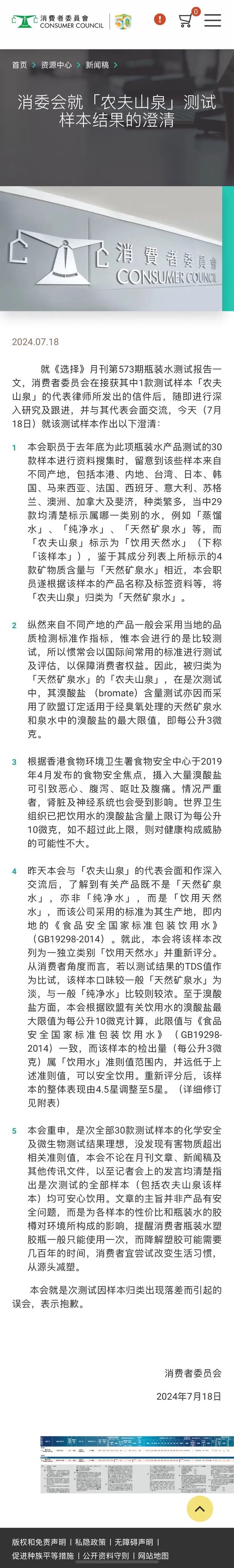 香港消委会官网发布澄清声明称,昨天本会与农夫山泉的代表会面和作深入交流后,了解到有关产品既不是天然矿泉水’,亦非‘纯净水’,而是‘饮用天然水’,而该公司采用的标准为其生产地,即内地的《食品安全国家标准包装饮用水》(GB19298-2014)。就此,本会将该样本改列为一独立类别‘饮用天然水’并重新评分。重新评分后,该样本的整体表现由4.5星调整至5星。
