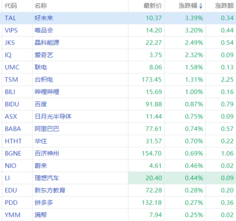 其中,好未来、唯品会涨超3%,晶科能源、爱奇艺涨超2%,哔哩哔哩涨1%,百度、阿里、蔚来、理想汽车、拼多多跟涨。