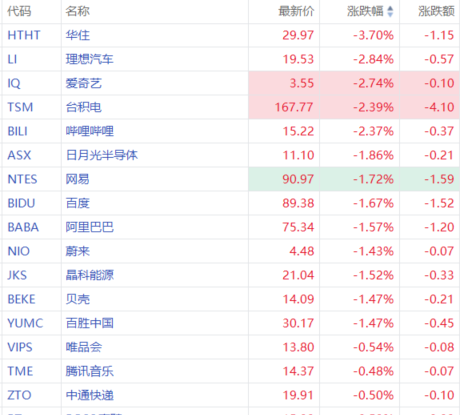 其中,华住跌超3%,理想汽车、爱奇艺、台积电、哔哩哔哩跌超2%,网易、百度、阿里、蔚来、贝壳跌超1%。