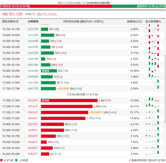 过去一周,恒指牛证累计约1.56亿港元资金净流入部署多单;恒指熊证则月1.91亿港元资金净流出套现。街货分布方面,至上周五,恒指牛证街货主要集中在收回价17000点至17400点之间,累计相当约5259张期指合约;恒指熊证街货相对分散,在收回价17700点至18400点之间,累计相当约2222张期指合约。