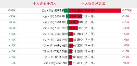 淡仓(认沽证及熊证)方面,过去一周,腾讯控股、阿里巴巴、美团等相关淡仓分别约2071万、511万及375万港元资金净流出套现;中石油、中芯国际、金沙中国等相关淡仓录少了资金净流入。