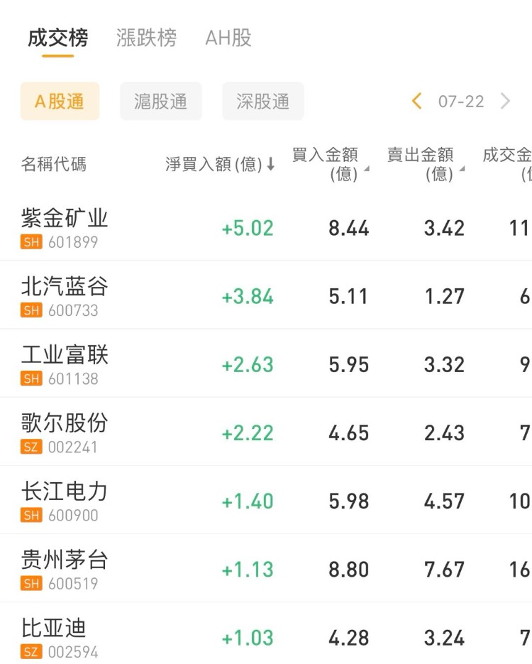 北向资金今日净买入19.73亿元。紫金矿业、北汽蓝谷、工业富联分别获净买入5.02亿元、3.84亿元、2.63亿元。中信证券净卖出额居首,金额为4.79亿元。
