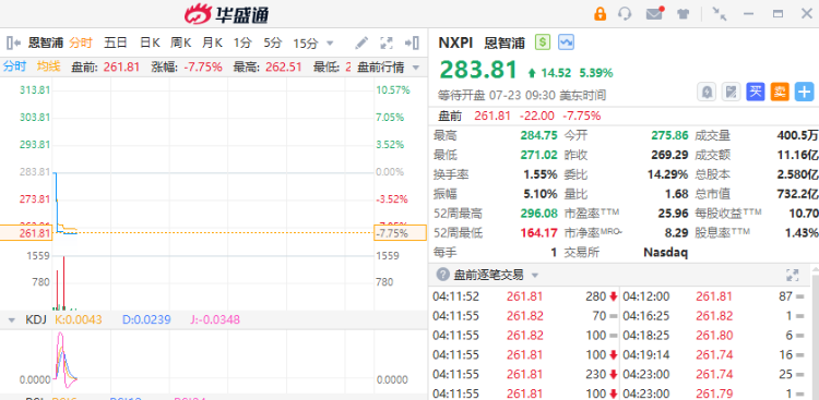 恩智浦盘前跌7.75%,Q2营收31.3亿美元,同比下降5.2%,汽车业务拖累收入表现低于预期,业绩指引疲软。