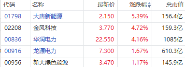风电股普遍走高,截至发稿,大唐新能源涨超5%,金风科技、华润电力涨超4%,龙源电力、新天绿色能源涨超1%。