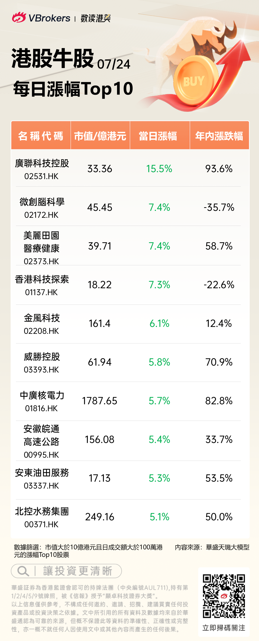 發仔统计了每日港股涨幅Top10,具体名单如下: