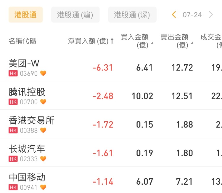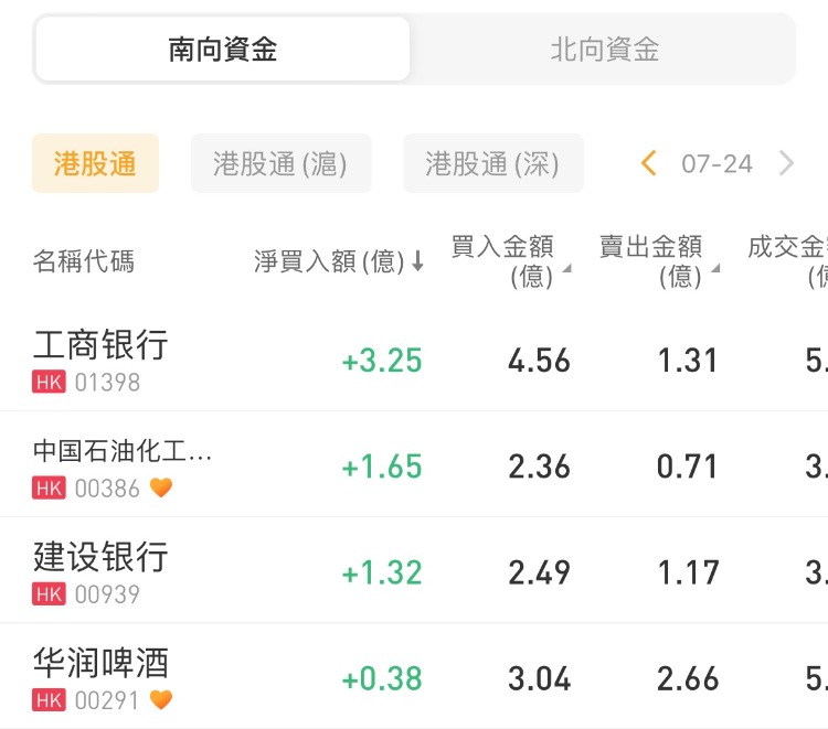 工商银行、中国石油化工股份、建设银行分别获南下资金净买入3.25亿港元、1.65亿港元、1.32亿港元;美团-W、腾讯控股遭净卖出6.31亿港元、2.48亿港元。