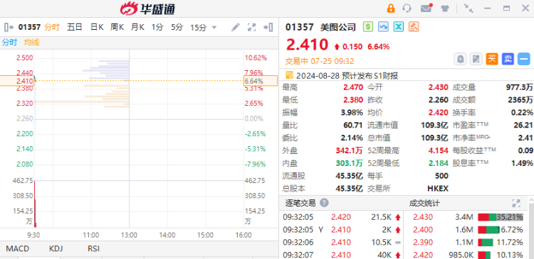 7月25日,美图公司(01357)盈喜后高开,截至发稿,涨6.64%,报2.41港元,成交额2365万港元。