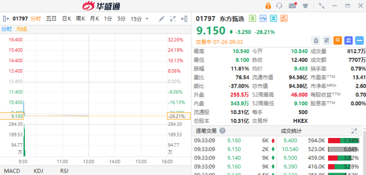 东方甄选昨日宣布旗下知名主播董宇辉辞职,港股早盘,东方甄选(01797)、新东方-S(09901)集体低开。截至发稿,东方甄选迅速跌超26%,报9.15港元;新东方-S跌超6%。