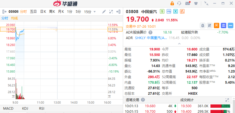 中国重汽(03808)早盘高开,截至发稿,涨11.55%,报19.7港元,成交额1.107亿港元。