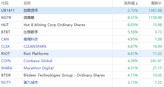 华盛资讯7月26日消息,比特币突破68000美元/枚,带动美股市场加密货币概念股持续走高,微策略MicroStrategy $MSTR 涨超8%,比特数字涨超5%,Marathon Digital $MARA 、Coinbase $COIN 、Riot Platforms $RIOT 、CLEANSPARK涨超4%,嘉楠科技 $CAN 涨近4%。