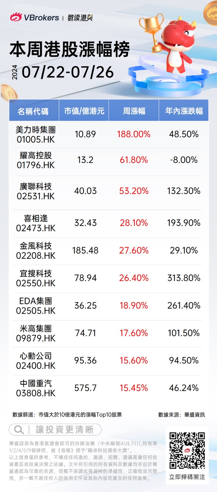 發仔梳理了每周港股涨跌幅Top10榜单,供投资者参考。