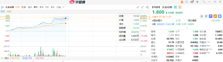受益无人驾驶出租车这一热点,大众公用(01635.HK)股价再度走强,盘中涨超40%,报1.8港元。