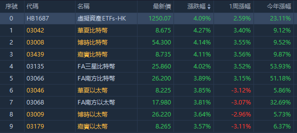 特朗普谋建比特币战略储备,比特币走强向上逼近7万大关,带动港股加密货币ETF全线上涨,截至发稿,嘉实比特币、博时比特币、华夏比特币涨超4%;华夏以太币、博时以太币、嘉实以太币等涨超3%。