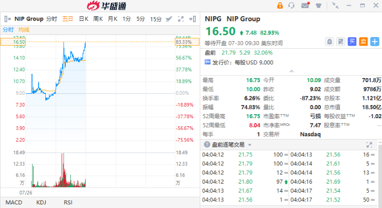 “赌王”之子何猷君旗下星竞威武 $NIPG 盘前再涨32%,昨日该股暴涨83%。