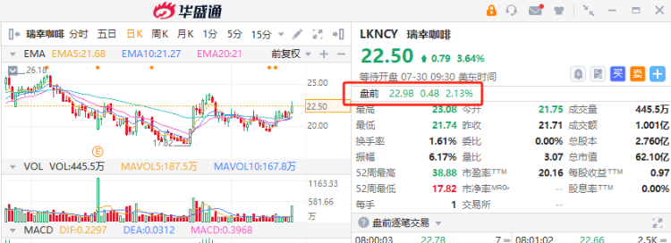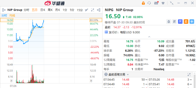 次新股星竞威武 $NIPG 今日盘前一度再升30%,现转跌13%;Paypal盘前涨超6%,公司Q2营收同比增长8.2%高于市场预期;瑞幸咖啡盘前涨2%,Q2营收同比增长35.5%创历史新高。