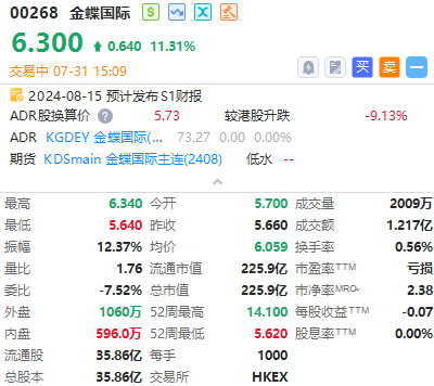 金蝶国际(00268)现涨超11%,截至发稿,涨11.36%,报6.3港元,成交额1.21亿港元。