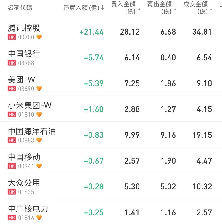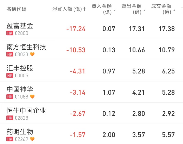 腾讯控股、中国银行、美团-W分别获南下资金净买入21.44亿港元、5.74亿港元、5.39亿港元;盈富基金、南方恒生科技遭净卖出17.24亿港元、10.53亿港元。