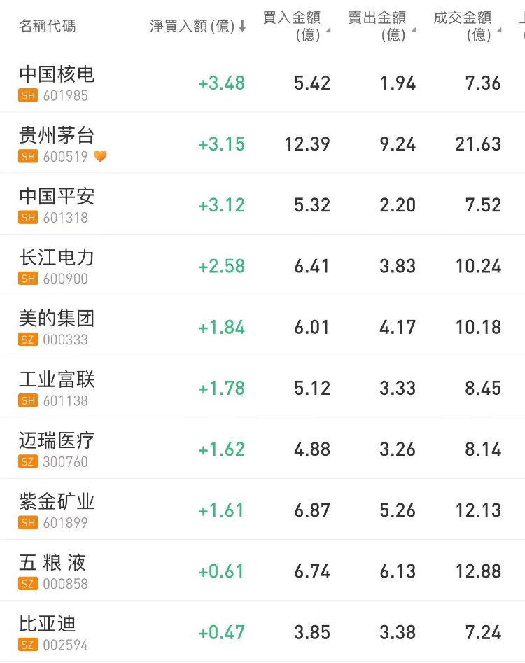 北向资金今日大幅净买入195.8亿元,为沪深港通开通以来第七大单日净买入额。中国核电、贵州茅台、中国平安分别获净买入3.48亿元、3.15亿元、3.12亿元。宁德时代净卖出额居首,金额为3.69亿元。