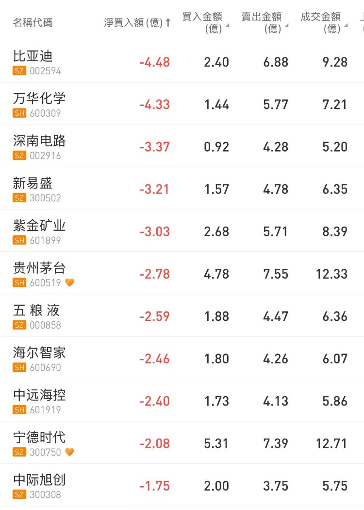 北向资金今日净卖出57.01亿元,比亚迪、万华化学、深南电路分别遭净卖出4.48亿元、4.33亿元、3.37亿元;药明康德逆市获净买入2.97亿元。