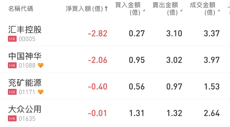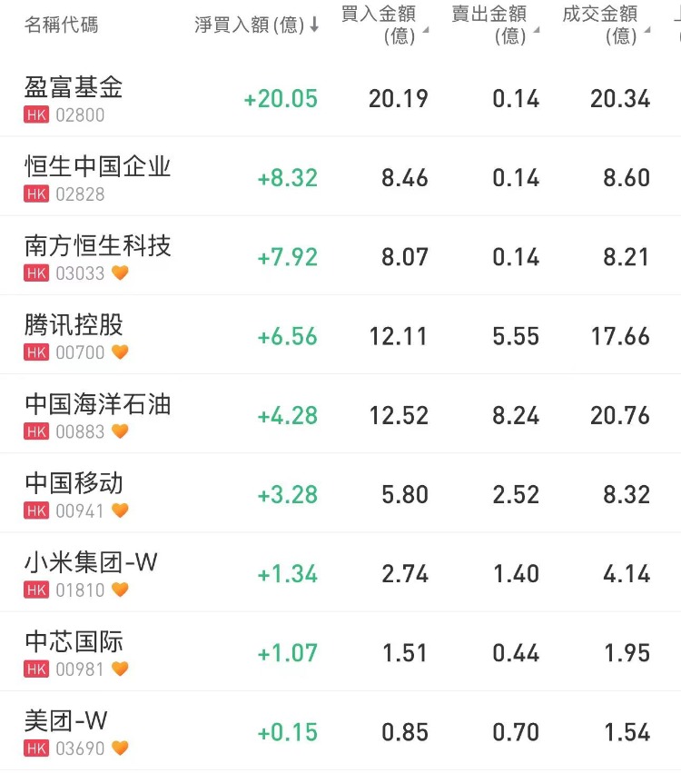 盈富基金、恒生中国企业、南方恒生科技分别获南下资金净买入20.05亿港元、8.32亿港元、7.92亿港元;汇丰控股、中国神华遭净卖出2.82亿港元、2.86亿港元。
