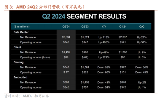 拆分来看,AMD在2Q24其实属于“一半海水、一般火焰”的状态。数据中心和客户端业务的强劲增长掩盖了公司另外两项业务的走弱。不过严格上来说,这更像是一个行业内的景气流动,AI浪潮带动了算力需求以及AI PC的增量,但传统的游戏显卡业务和嵌入式业务则因为性能需求瓶颈而处于清库存的周期中。