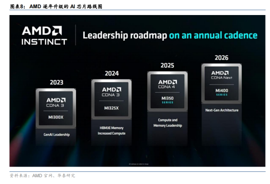 有关GPU性能方面的对比这里不做过多赘述,但整体来看,AMD的新产品MI300X在显存容量、内存带宽、各精度算力与训练性能方面都能与英伟达H100相媲美,这也是季度营收超预期的主要原因之一。公司也计划效仿英伟达,在2024-2026年间继续推出新的算力产品,新一代MI325X系列产品有望在24Q4推出;基于CDNA4架构的MI350系列产品有望在2025年发布,落实“技术才是第一生产力”。