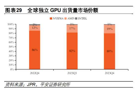 2005年,AMD以54亿美元的价格收购ATI,开启了自身的GPU显卡业务,凭借本次收购,AMD成为高端显卡/独立显卡领域的参赛者,开启了和英伟达多年的相争历史。截至2023年4季度,AMD的独立显卡市场规模约为19%,排名世界第二,但位列第一的英伟达却独占了80%以上的市场,双方差距明显。