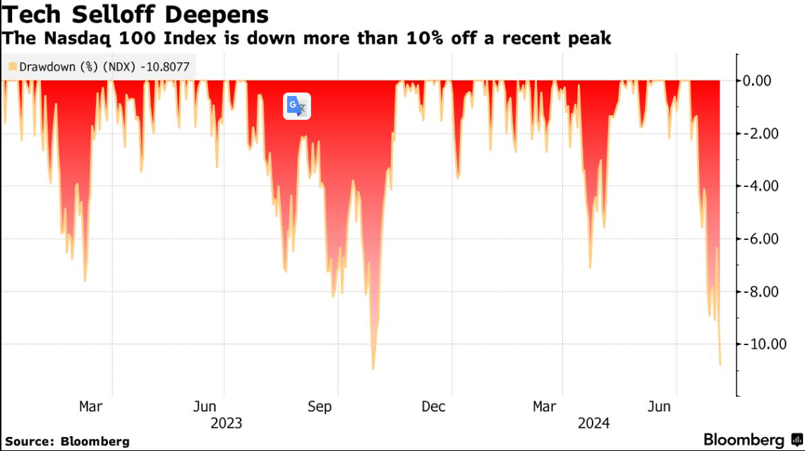 大型市值同行,包括微软公司、亚马逊公司和谷歌母公司,都从7月初创下的历史最高点下跌。纳斯达克100指数的成员总共在这段时间内蒸发了超过3万亿美元的价值,其中包括英伟达公司和特斯拉公司,每个都下跌超过20%。与此同时,苹果股价比历史最高点下跌约6%。
