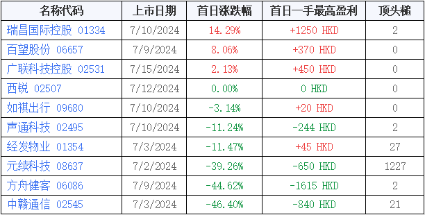 瑞昌国际挂牌首日表现最佳,当天开报1.3港元,较招股价高23.81%,全日最高见1.55港元,若高位抛售,一手账面最高可赚1250港元。最终收盘报1.2港元,较招股价高14.29%,以收盘价计算,则一手赚375港元。