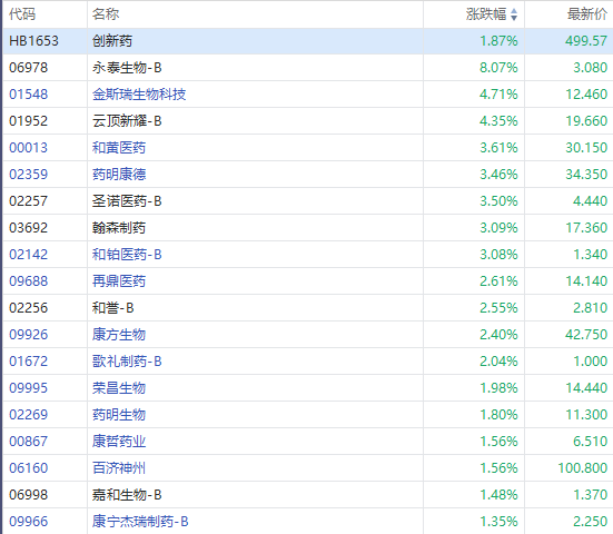 CXO概念股全线上扬,截至发稿,永泰生物-B涨超8%,金斯瑞生物科技、云顶新耀-B涨超4%,和黄医药、药明康德涨超3%。