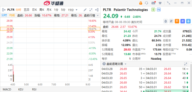 Palantir最新估计,年度收入介乎27.4亿至27.5亿美元之间,此前预期为26.8亿至26.9亿美元;第三季收入介乎6.97亿至7.01亿美元之间,市场预期为6.791亿美元。