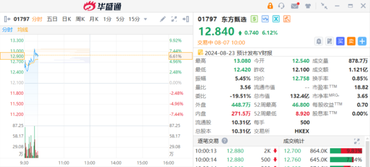 东方甄选(01797)涨超6%,截至发稿,涨6.12%,报12.84港元,成交额1.21亿港元。