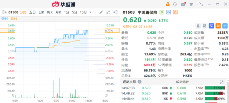 中国再保险 $01508.HK 午后涨超8%,截至发稿,涨8.77%,报0.62港元,成交额1508万港元。