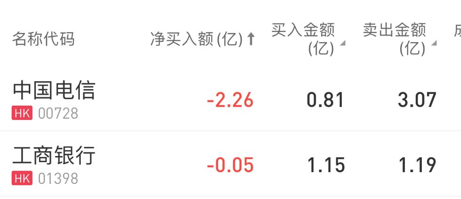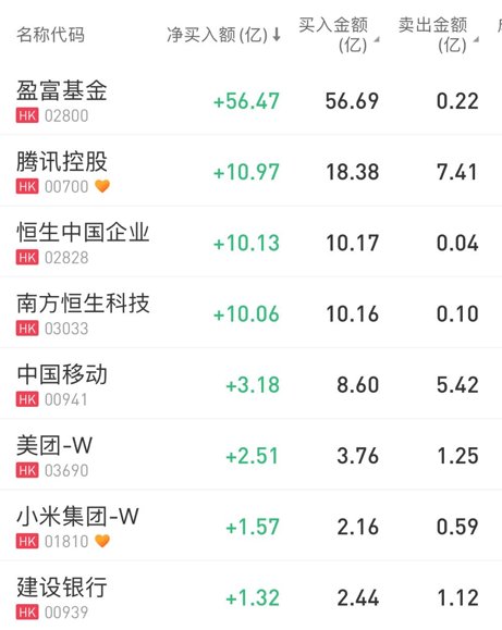 净买入盈富基金56.47亿、腾讯10.97亿、恒生中国企业10.13亿;净卖出中国电信2.26亿。