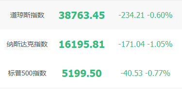 电脑硬件、半导体跌幅居前,超微电脑跌超20%,戴尔科技跌超7%,Arm跌超5%,美国黄金公司、科尔戴伦矿业跌超4%,恩智浦、英特尔、安森美半导体跌超3%,惠普、美光科技跌超2%。