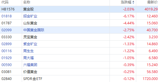 黄金股集体受压,招金矿业(01818)跌6.17%,山东黄金(01787)跌4.44%,中国黄金国际(02099)跌2.75%,灵宝黄金(03330)跌2.42%,紫金矿业(02899)跌1.33%。