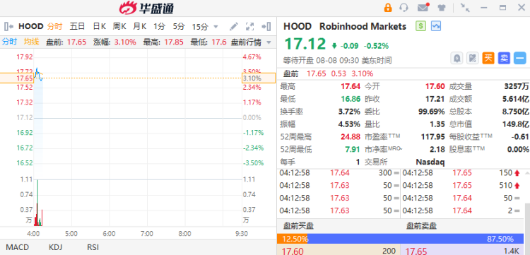 Robinhood盘前涨近3%。消息面上,Robinhood第二季度营收为6.82亿美元,同比增长40.3%,好于市场预期的6.32亿美元;每股收益为0.21美元,超过市场预期的0.15美元,上年同期为0.03美元。