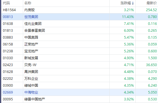 受益于7月房企融资规模创年内新高,港股房地产股多数走强,其中世茂集团(00813.HK)、佳兆业集团(01638.HK)、中国奥园(03883.HK)、新城发展(01030.HK)、万科企业(02202.HK)分别上涨11.43%、7.41%、5.47%、4.38%。