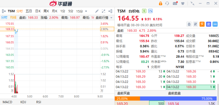 台积电盘前涨近3%,消息面上,台积电公布,7月合并营收约为新台币2569.53亿元,创单月营收历史新高,较上月增加23.6%,较去年同期增加44.7%。2024年1至7月累计营收约为新台币15231.7亿元,较去年同期增加30.5%。