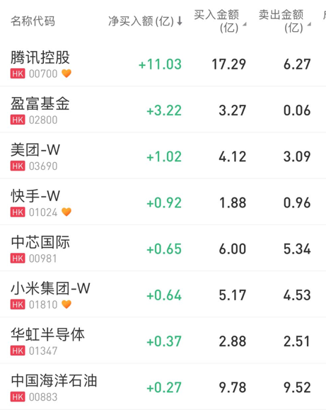 净买入腾讯11.03亿、盈富基金3.21亿、美团1.02亿;净卖出中国移动4.97亿。据统计,南下资金已连续12日净买入腾讯,共计94.2221亿港元